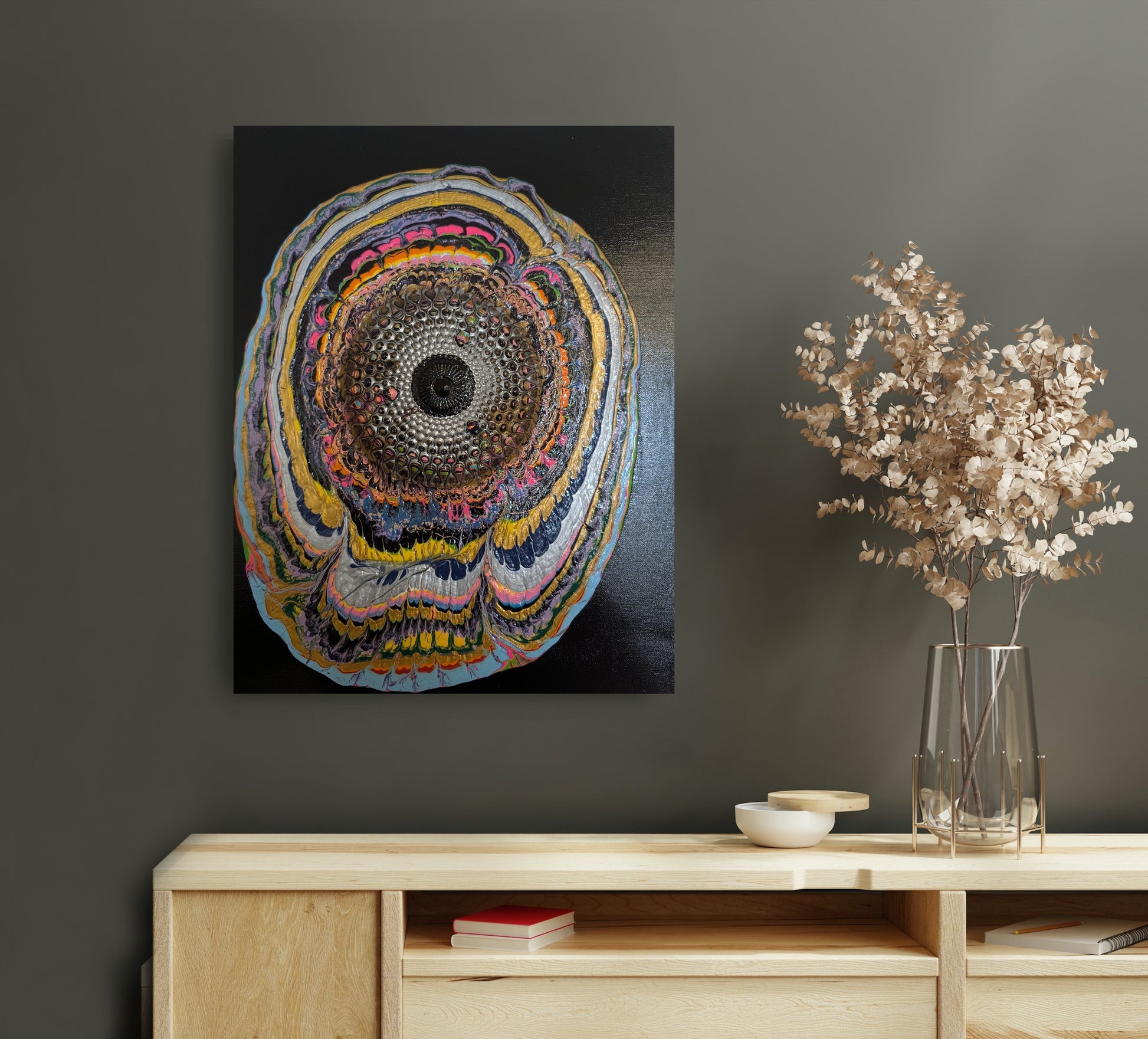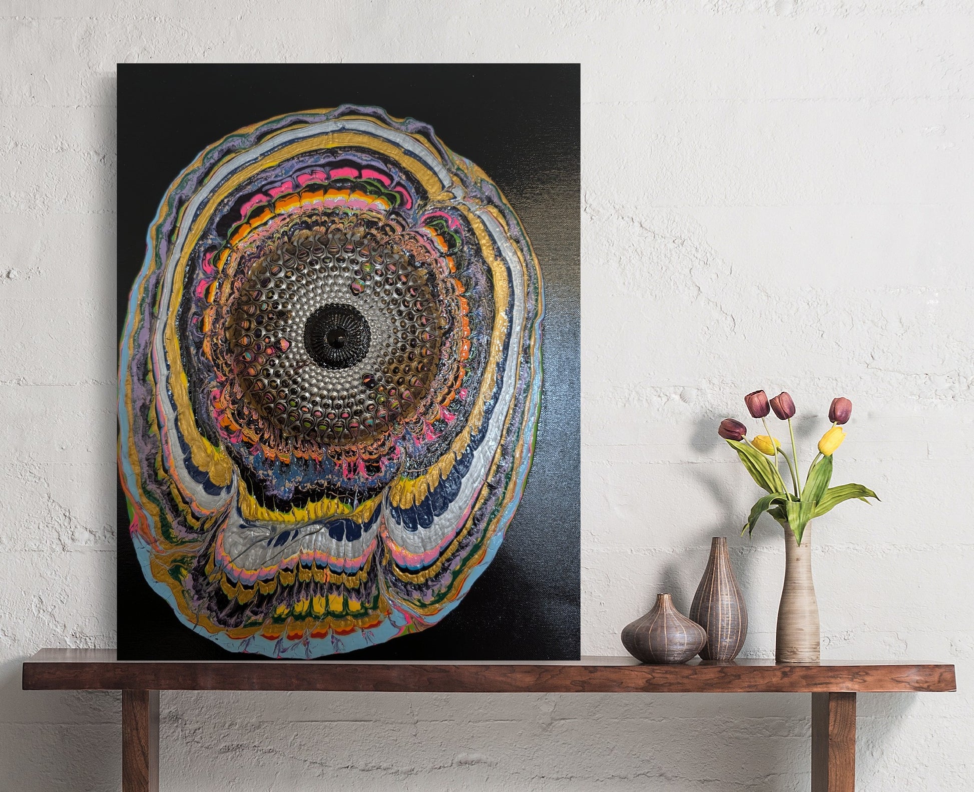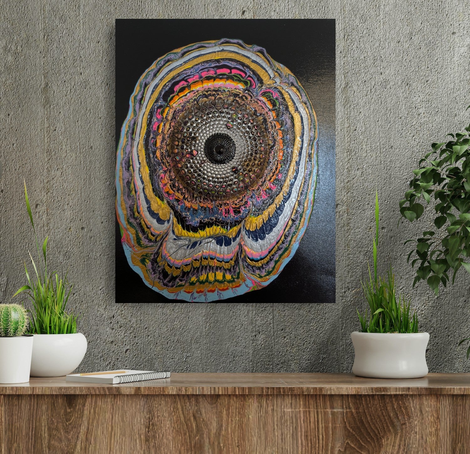 Using mixed media as canvas to create a textured depth illusion.